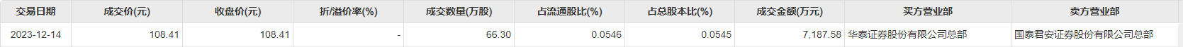 12月14日,韦尔股份今日大宗交易成交66.3万股,成交额7187.58万元,占当日总成交额的9.44%,成交价108.41元,较市场收盘价持平。