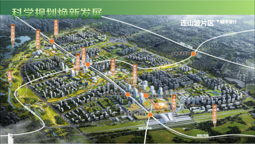 透过清晰的规划可以发现,未来,东安湖和连山坡两个片区 ,将共同承载提高龙泉驿城市竞争力和辐射带动力的重要任务,成为成都东部的核心区域。