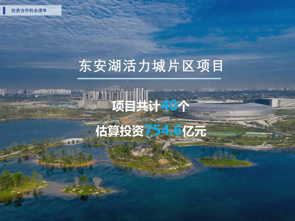 今年3月,成都经开区(龙泉驿区)2023年城市价值推广暨“三个做优做强”六大功能片区投资机会清单发布会中,龙泉驿首次将东安湖活力城片区发展蓝图介绍到大众眼前,片区共计40个项目估算投资金额754.6亿元,占据了整个龙泉驿区近三分之一,成都的城市发展在东部再次画下浓墨重彩的一笔。