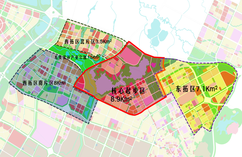 政策的倾斜足以反映区域的重要程度。根据规划显示,东安湖活力城规划面积共29 km²,分核心起步区、东拓区、西拓区3个区域。其中“核心起步区”规划面积8.9km²。