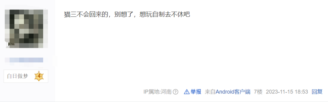 吧友七嘴八舌地在楼下回复着,有说当年的大佬早退隐回归现实的,也有说“蓝猫工作室”在《节奏大师》下架的时间里已经入职了另一款音乐游戏公司,如今早已不是为爱发电,再加上竞品关系和现在《节奏大师》TP校验的加入,反正得到的统一结论就是肯定回不来了。甚至更多吧友在帖子下展开了想玩自制谱去另一款游戏的讨论。
