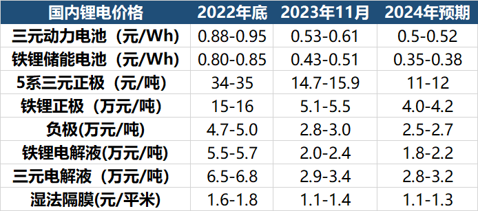 数据显示,三元动力电池在2022年时,最低价格为0.88-0.95元/Wh,如今已经跌至0.53-0.61元/Wh,预期2024年还将继续下滑至0.5-0.52元/Wh;铁锂储能电池价格在2022年最低价格为0.8-0.85元/Wh,如今迅速跌至0.43-0.51元/Wh,预期2024年还将继续下滑至0.35-0.38元/Wh……除此之外,5系三元正极、铁锂正极、负极、铁锂电解液、三元电解液、湿法隔膜等重要材料价格均在迅速下滑之中。