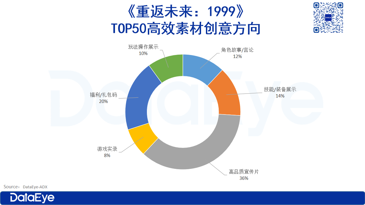 《重返未来:1999》上线以来高效素材TOP50主要分为“高品质宣传片”、“福利/礼包码”、“技能/装备展示”、“角色故事/言论”、“玩法操作展示”、“游戏实录”六个方向。