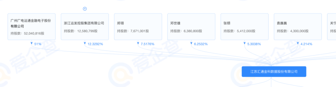 如在新三板挂牌的汇通金科(833631.NQ),爱企查显示,其第二大股东就是浙江运发背后的浙江运发控股集团有限公司(下称“运发集团”),持股比例12.33%。