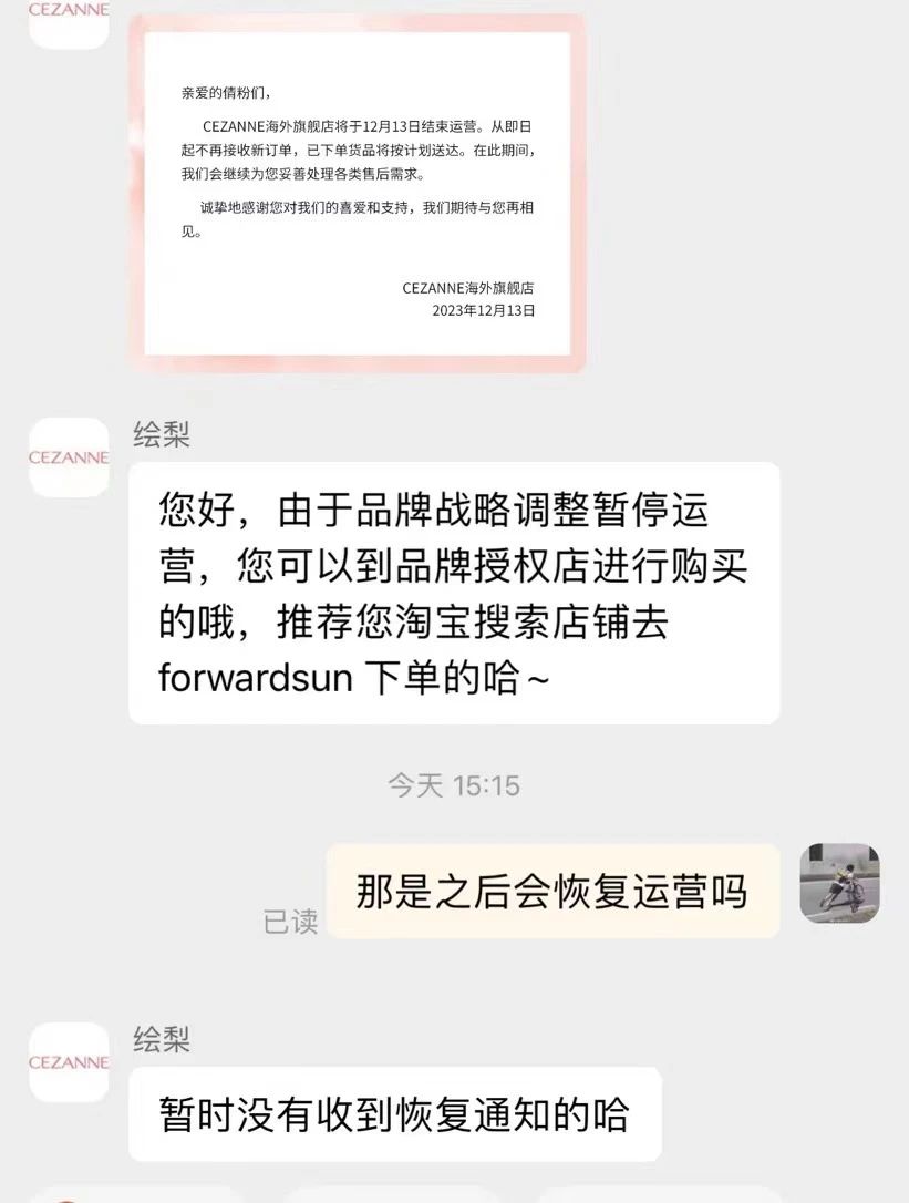 CEZANNE方客服则向化妆品报表示,本次闭店是品牌战略调整暂停运营,目前没有收到恢复运营的通知。该客服还称,如消费者需购买产品可到品牌授权店ForwardSun进行购买。