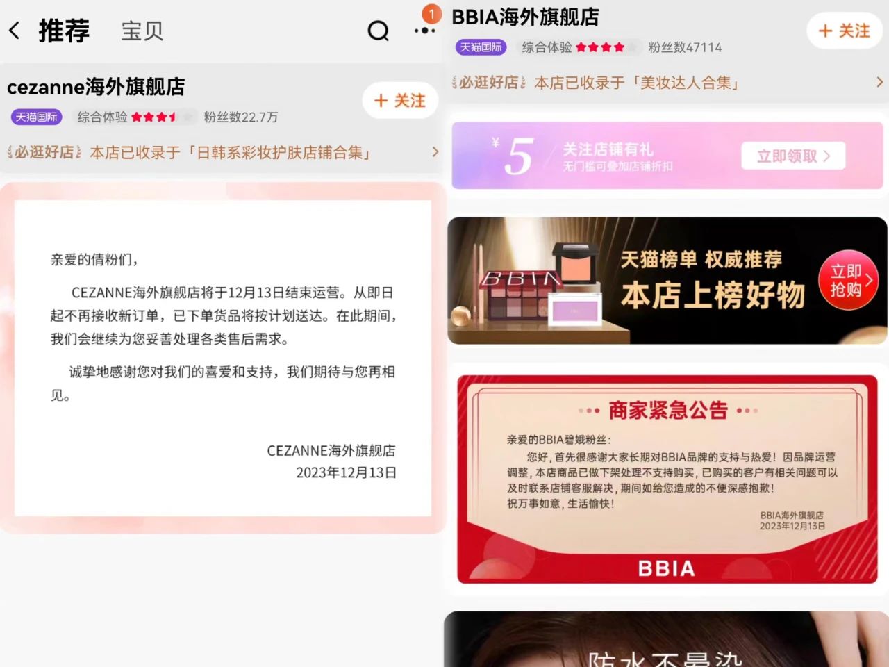 12月13日,日妆品牌CEZANNE倩诗丽和韩妆品牌BBIA突然宣布关停其天猫海外旗舰店。