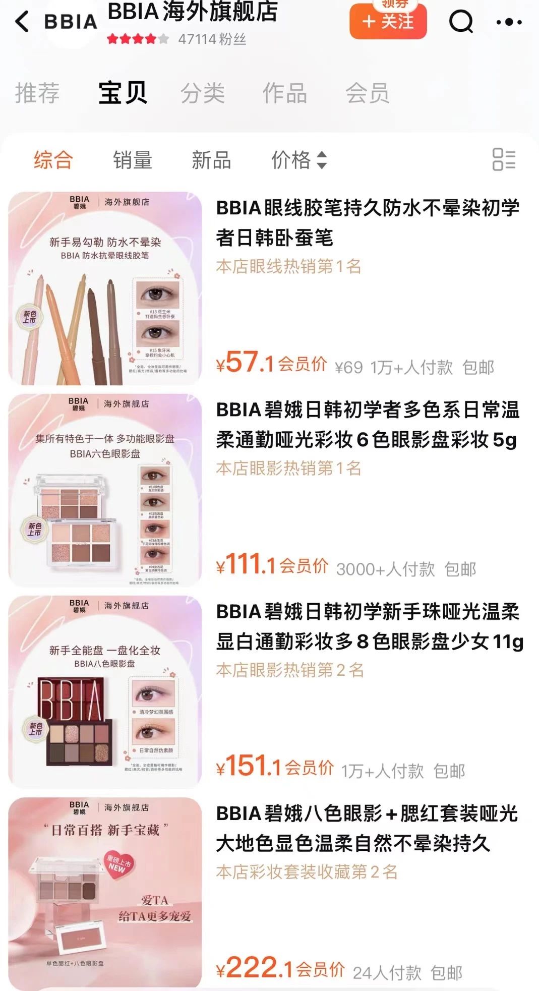 从中国市场来看,在韩妆的“黄金年代”,BBIA的单色眼影、腮红等产品曾红极一时;但此后随着韩妆整体势微,BBIA也逐渐消失在中国消费者视野之中。而在近一年来,随着虞书欣、沉默小猴子等明星和美妆博主的分享,不少消费者种草了BBIA的腮红、粉笔等产品,BBIA在小红书的热度有所提升。BBIA也在小红书开设了官方账号,粉丝量达5000+,其最近一次更新在2023年11月28日。目前,BBIA海外旗舰店粉丝约4.7w,眼线笔为销量第一,已售2w+,其他热卖产品如腮红、眼影等销售量也都超过1w件。