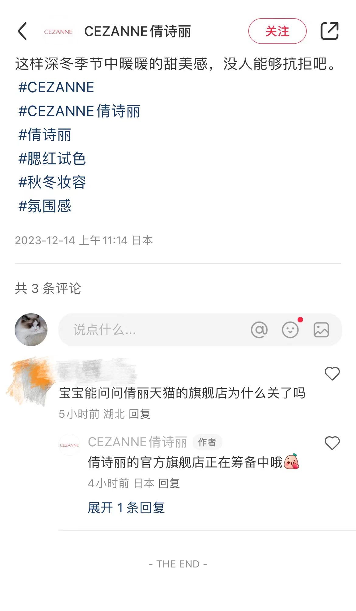 此外,CEZANNE于2021年5月开设了小红书官方账号,粉丝量近8000,而在今日(12月14日)上午,该品牌方才发布了人气腮红试色,更新了小红书动态。值得注意的是,在该帖子下,有网友询问闭店原因,CEZANNE方回复该网友,“倩诗丽的官方旗舰店正在筹备中。”