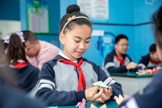 “叮——”下课铃声一响,打虎山路第一小学三(6)班的学生们玩起了"翻花绳"的游戏,大家跟着老师的指导,一双双灵巧的小手翻出了有趣的花样。在这“课间十分钟”,孩子们通过沉浸式体验集体指尖游戏放松了学习带来的紧张情绪。