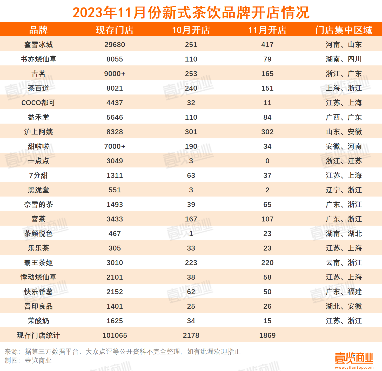 整体行业情况:从整体开店数量来看,2023年11月份,国内20家连锁茶饮品牌一共新开门店1869家,与上月数据相比增速放缓,现存门店一共101065家。