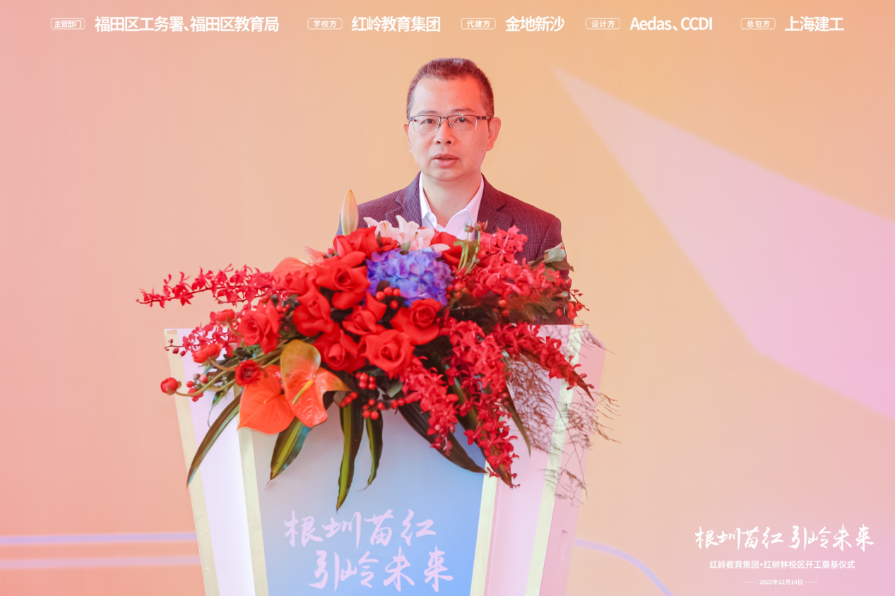12月14日,位于福田区沙嘴路和金地一路交汇处,地铁上沙站【7号线与22号线(规划中)换乘站】附近的红岭教育集团·红树林校区,开工奠基仪式圆满礼成,福田区委常委、福田区人民政府副区长、党组成员朱伟华,福田区建筑工务署署长马宇政,福田区建筑工务署副署长徐钢,福田区委教育工委委员、福田区教育局党组成员、副局长余巍,红岭教育集团党委书记张健,深圳市金地新沙房地产开发有限公司总经理王晓华,Aedas创办人纪达夫,Aedas执行董事陈川,CCDI联席总裁庄葵,上海建工深圳公司总经理刘杰,深圳创茂建设工程有限公司副总经理黄晓东,官媒和各主流媒体等嘉宾应邀出席,共同见证红岭集团全新里程。