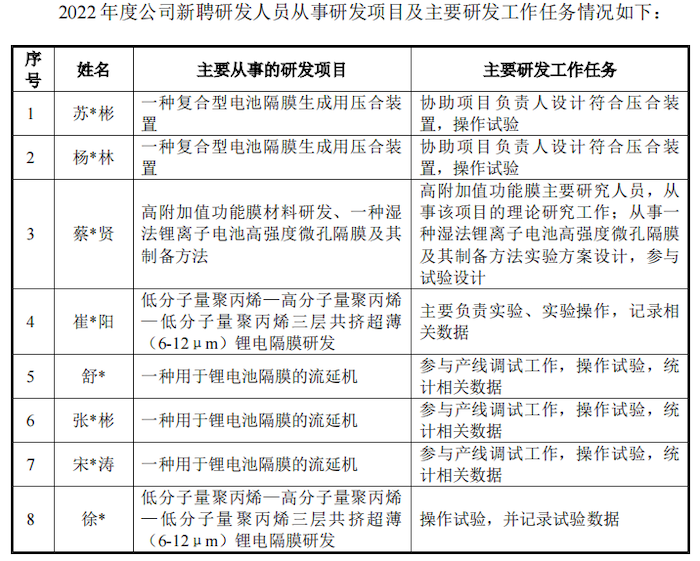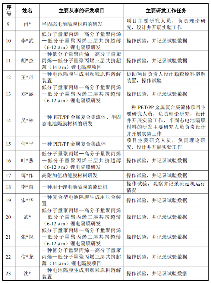 同行业上市公司星源材质(300568.SZ)2021年披露拥有401名研发人员,学历在本科及以上的有216名,占比53.87%;恩捷股份(002812.SZ)2022年披露拥有512名研发人员,其中硕士及以上的有104人,本科及以下的有408人;璞泰来(6003659.SH)2021年末披露的研发人员799人,其中本科及以上446人,占比55.82%。