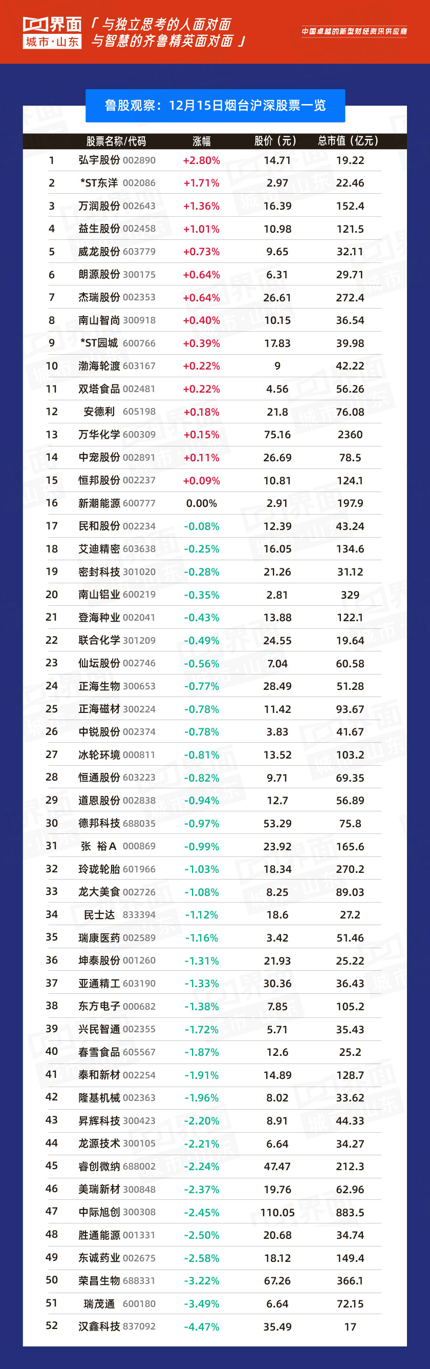 烟台市涨幅榜首:弘宇股份(002890),涨幅:2.8%,股价14.71元,总市值19.22亿元;
