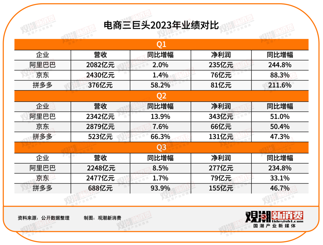 而在业绩层面,拼多多的优势在于增速,阿里仍保持着体量的优势,而京东的处境越发尴尬,其营收规模高于阿里,净利润却低于拼多多,增速也不及两位对手。