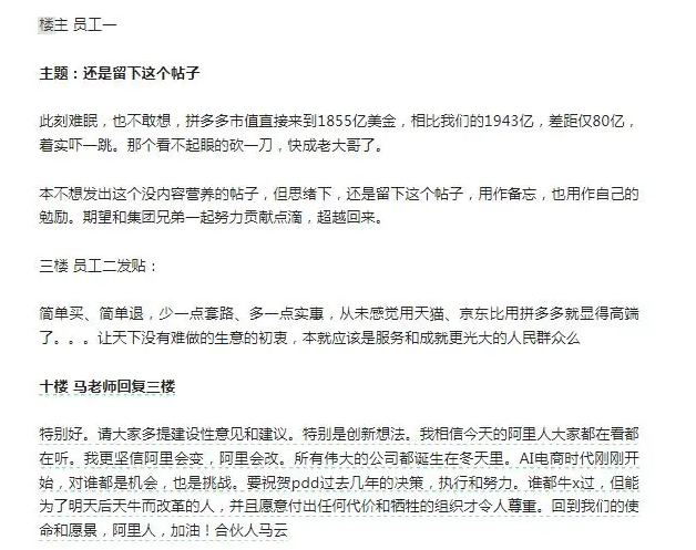 马云亲自下场回复,在对拼多多表达祝贺的同时,他指出,“所有伟大的公司都诞生在冬天里”,“阿里会变,阿里会改,能为了明天后天牛而改革的人,并且愿意付出任何代价和牺牲的组织才令人尊重。”