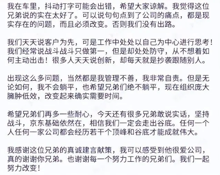 而在马云回复“阿里会变”后,刘强东也借回复自家员工的契机说出了心里话。