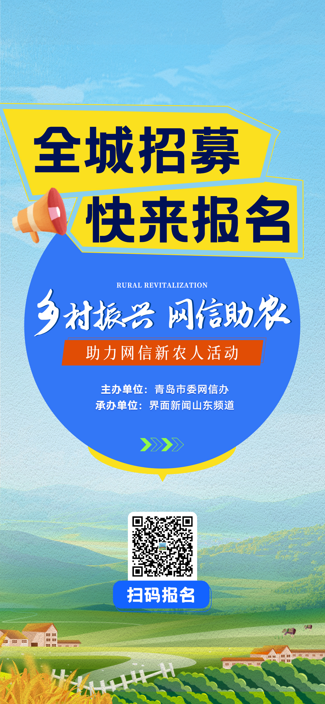 为紧抓乡村振兴工作中的“人才”要素,进一步推进网络助力乡村振兴工作,青岛市委网信办特别策划“乡村振兴·网信助农”助力网信新农人活动,利用互联网、数字化、信息化赋能,助农扶农兴农富农,为青岛践行乡村振兴,贡献“网信力量”。