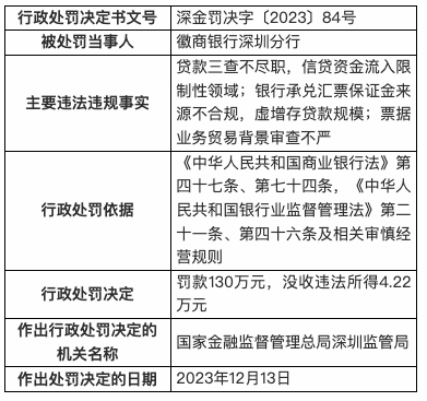 12月15日,国家金融监督管理总局深圳监管局行政处罚信息公开表显示,2023年12月13日,徽商银行深圳分行被罚款130万元,没收违法所得4.22万元。主要违法违规事实为:贷款三查不尽职,信贷资金流入限制性领域;银行承兑汇票保证金来源不合规,虚增存贷款规模;票据业务贸易背景审查不严。