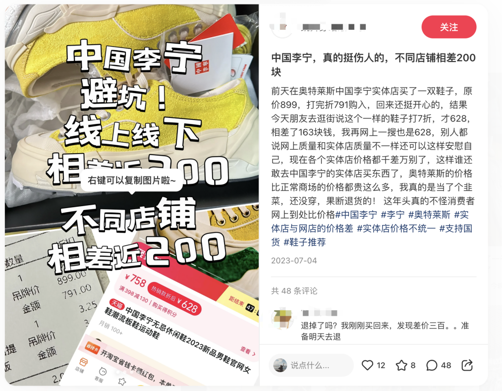 在小红书等社交媒体上,有不少网友吐槽称,在奥特莱斯中国李宁实体店买到的折扣鞋,比在网上以及其他线下门店的价格贵出200元。“现在各个实体店价格都千差万别了,这样谁还敢去中国李宁的实体店买东西。”