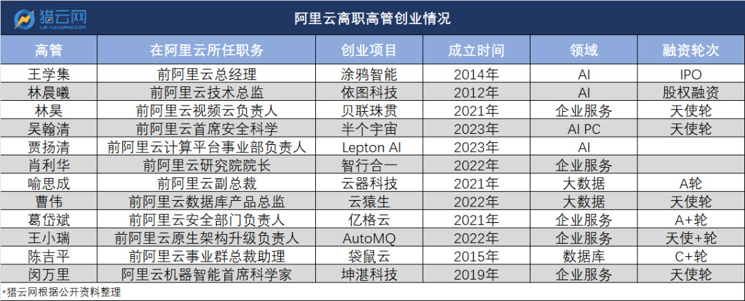 值得注意的是,阿里云创立十余年,离职去创业的高管普遍选择的是企服和AI赛道,一个专注商业化落地,一个专注技术工程化实践。这一点在阿里云的创始团队中就已经有所体现。