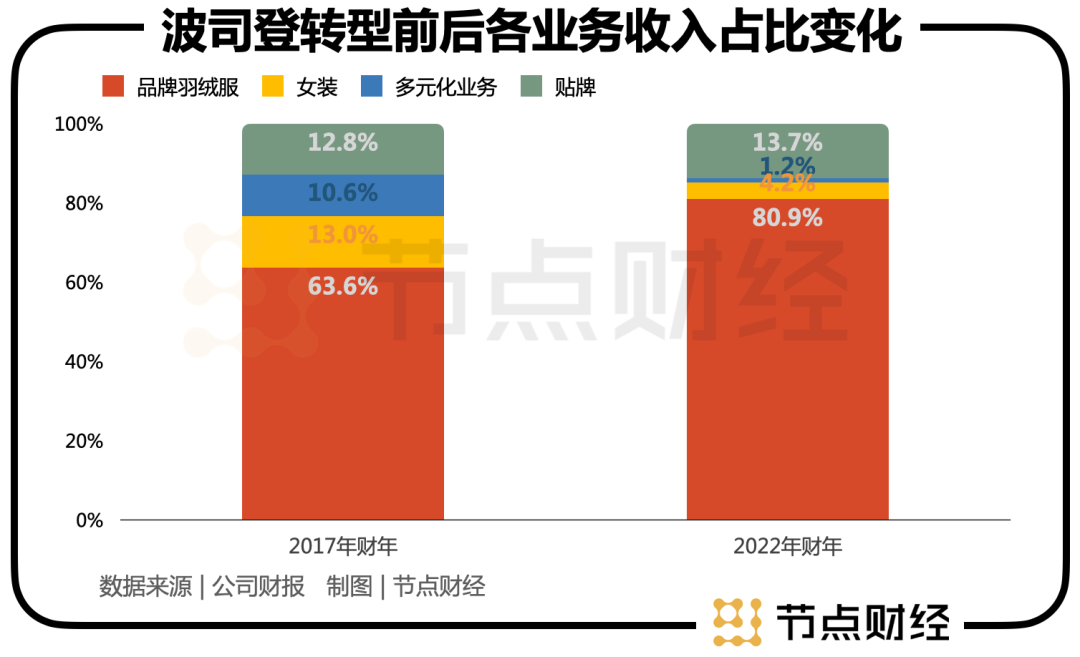 首先,在“聚焦主航道”方面,波司登品牌羽绒服业务收入占比从转型前(2017年)的六成多径直提升到超过八成,与此同时公司包括“女装”及“多元化服装”的合计收入占比从2017年财年的25.8%降至2022年财年的4.6%。