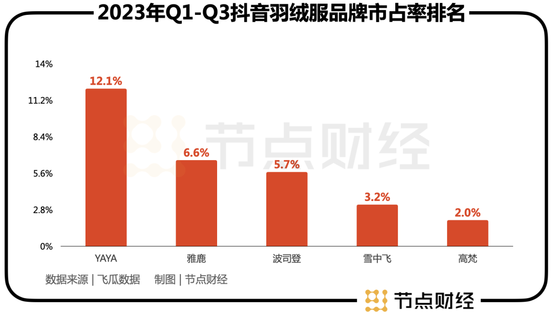 据《节点财经》了解,鸭鸭线上渠道的增长绝大多数来自抖音电商的贡献,飞瓜数据最近公布的一份报告显示,今年前三季度鸭鸭在抖音电商羽绒服市场的销售额市占率为12.1%,接近第二、三名之和。