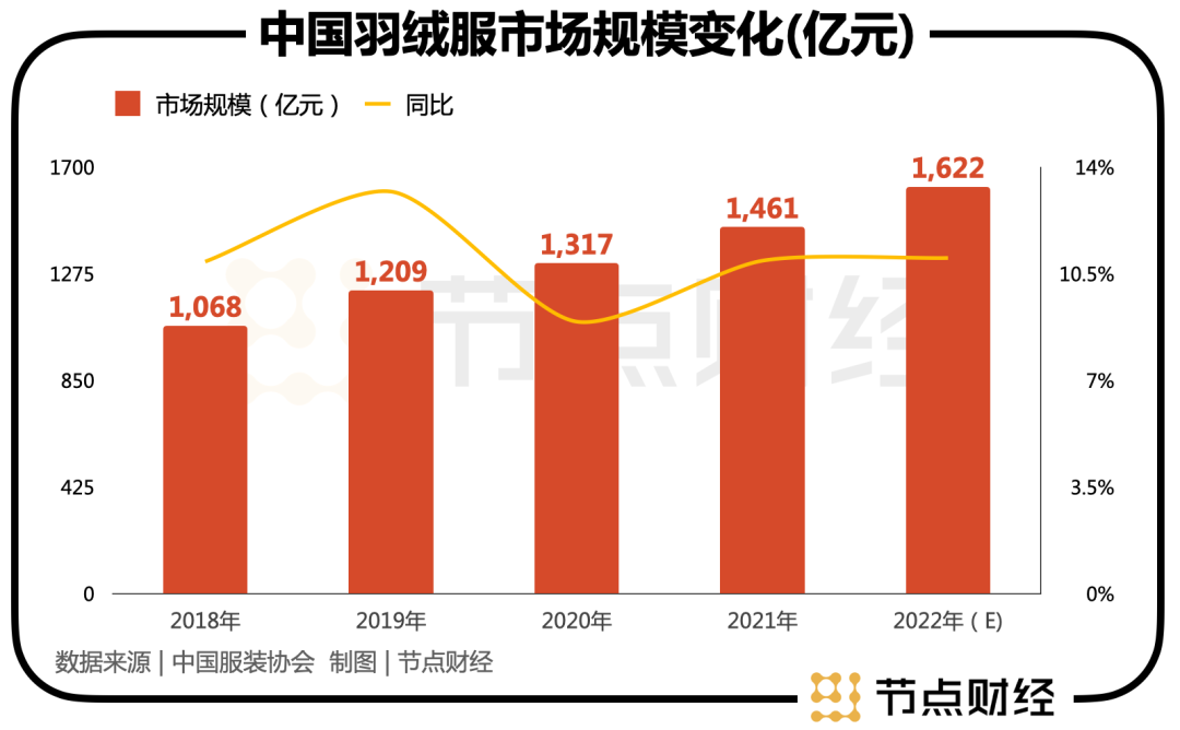 算下来,过去4年间,中国羽绒服市场的年复合增速高达近22%。