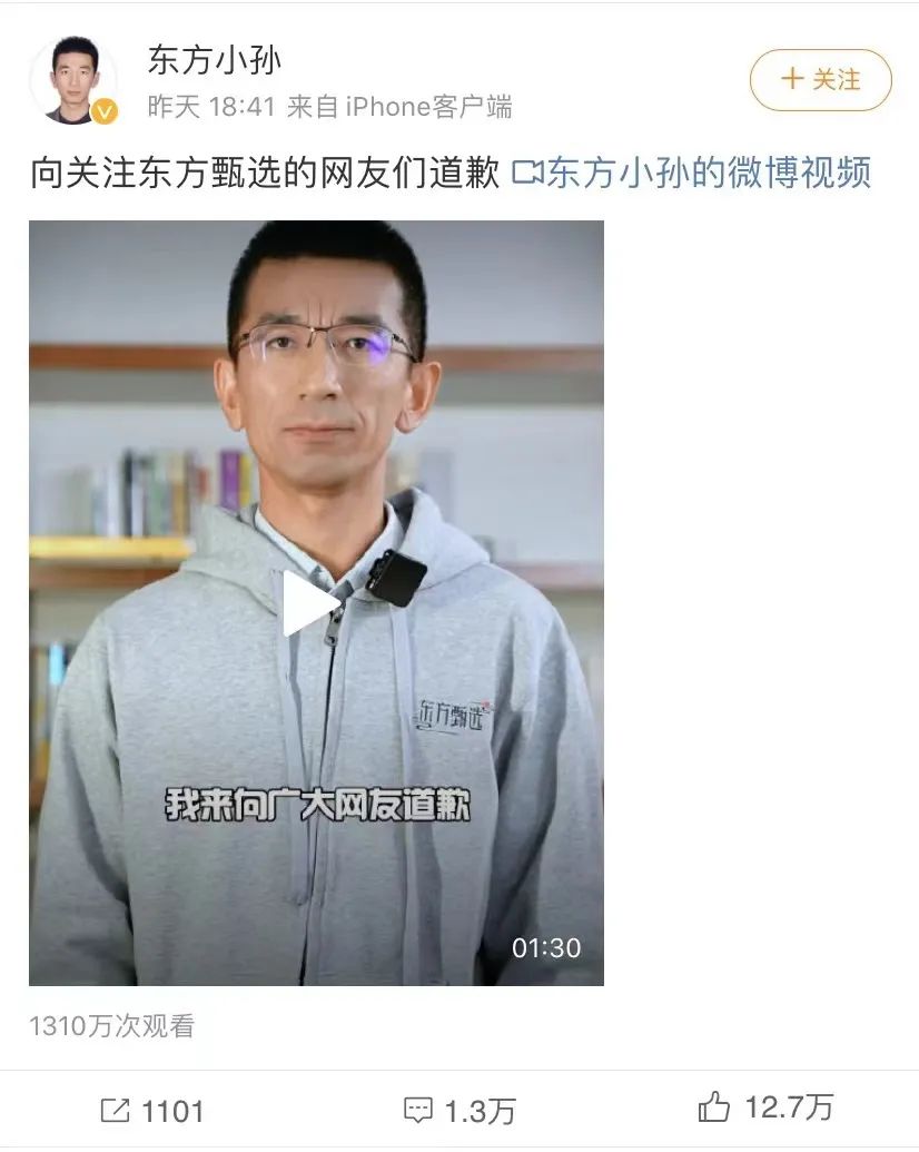 14日,俞敏洪发视频批评了孙东旭透露董宇辉年薪行为的不妥,说“小孙做事情年轻有冲动,但不够圆润”;孙东旭在微博上发布了视频,为自己之前直播中被大家关注的“摔手机”行为以及给粉丝扣“饭圈”帽子的事道歉。