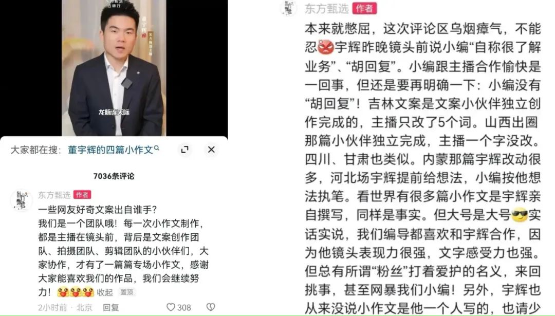 董宇辉和孙东旭在回应中都提到,那些文采飞扬的“小作文”有些是董宇辉亲自写的,有些是董宇辉提出思路、团队创作的,还有些则是完全由团队创作的。在“造星”的过程中,老板俞敏洪有意无意地暗示都是董宇辉写的,也算是行规。