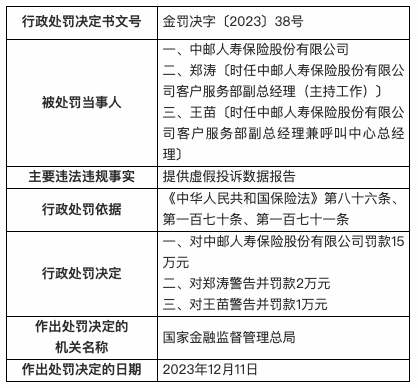 12月15日,国家金融监督管理总局行政处罚信息公开表显示,2023年12月11日,中邮人寿保险股份有限公司因提供虚假投诉数据报告,被处罚款15万元。时任中邮人寿保险股份有限公司客户服务部副总经理(主持工作)郑涛被警告并罚款2万元;时任中邮人寿保险股份有限公司客户服务部副总经理兼呼叫中心总经理王苗被警告并罚款1万元。