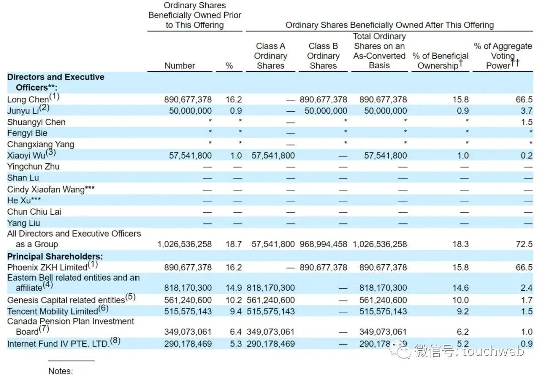 IPO后,陈龙持股为15.8%,有66.5%的投票权;Junyu Li持股为0.9%,有3.7%的投票权;Xiaoyi Wu持股为1%,有0.2%的投票权;