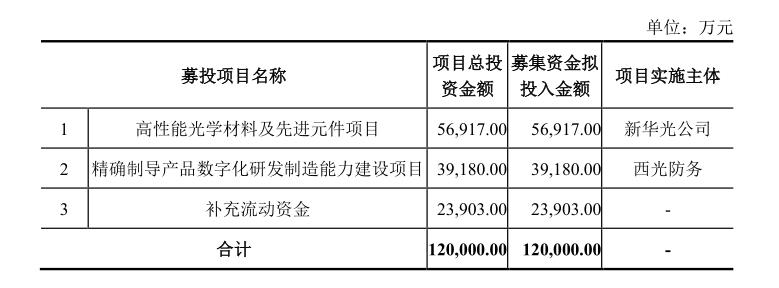 从此次募投的项目来看,高性能光学材料及先进元件项目总投资5.69亿元,精确制导产品数字化研发制造能力建设项目总投资3.92亿元,两大项目分别占募投总额的47.42%和32.67%,实施主体分别为新华光公司和西光防务。此外补充流动资金2.39亿元,占募投总额19.92%。