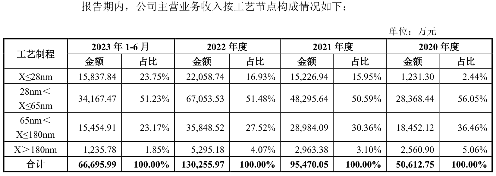 界面新闻注意到,按照工艺节点构成看,灿芯股份的主打工艺制程为28nm< X≤65nm,收入占比多年来保持5成以上,而工艺制程为65nm< X≤180nm以及X>180nm的收入占比则在逐年下降中,而逐渐递增的收入则来自X≤28nm工艺制程。2020年时金额1231.3万元,占比2.44%,到了2023年上半年金额1.58亿元,占比23.75%。