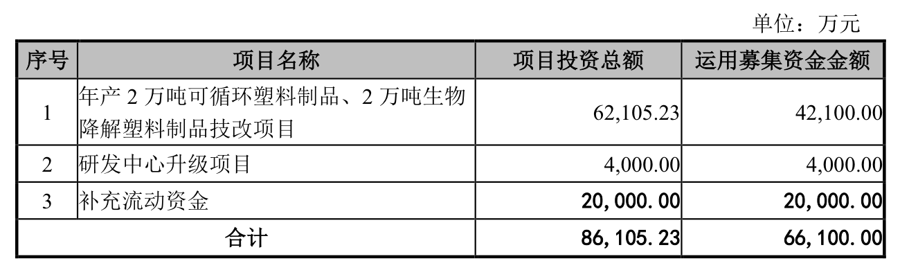 拟募的这6.61亿元,将投入3个项目,其中最为重要的,是“年产2万吨可循环塑料制品、2万吨生物降解塑料制品技改项目”,投入额4.21亿元。