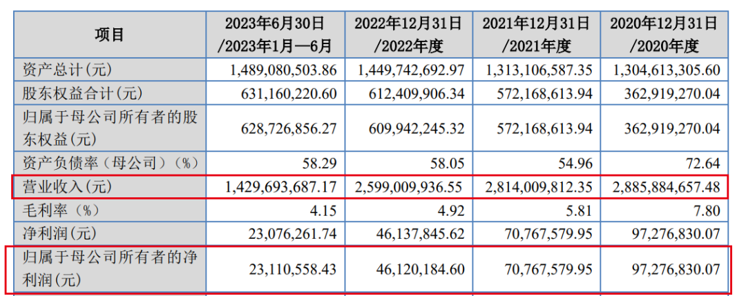 招股书显示,2020年-2022年,公司营收分别为28.86亿元、28.14亿元、25.99亿元;归母净利润9727.68万元、7076.76万元、4612.02万元。