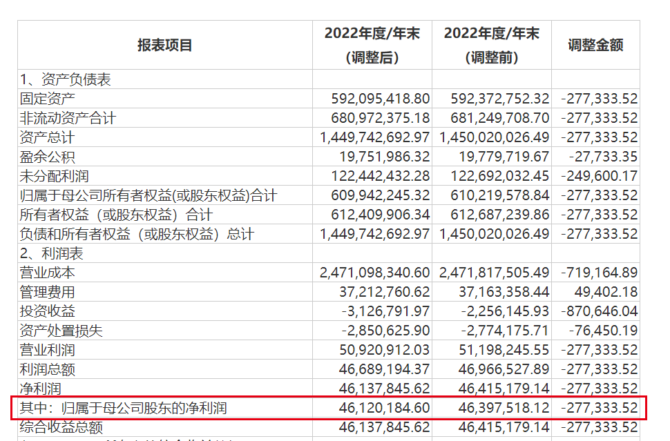 公开资料显示,2022年,公司个别固定资产入账滞后,涉及应补提2022年度折旧费27.73万元,其中计入营业成本22.79万元、计入管理费用4.94万元,相应调减固定资产账面价值27.73万元。