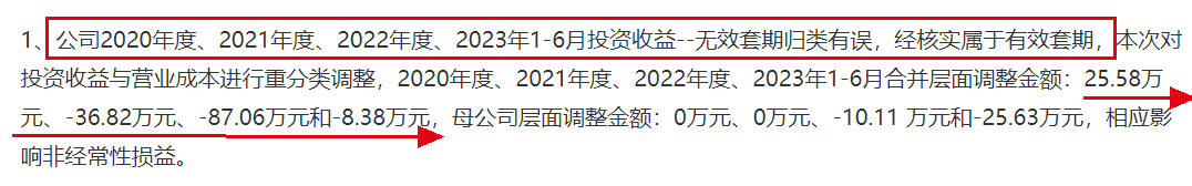 此外,在向前追溯两年数据后发现,公司2020年度、2021年度、2022年度、2023年1-6月投资收益--无效套期归类有误,经核实属于有效套期。