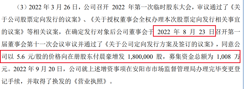 2022年3月,公司以5.6元/股的价格向在册股东付晨豪增发180万股,募集资金1008万元,全部用于补充流动资金。