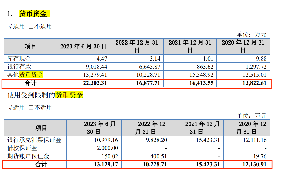 招股书显示,截至2023年6月30日,公司货币资金仅有2.23亿元。其中,使用受到限制的货币资金高达1.31亿元。这也意味着,公司可动用的货币资金尚不到亿元。