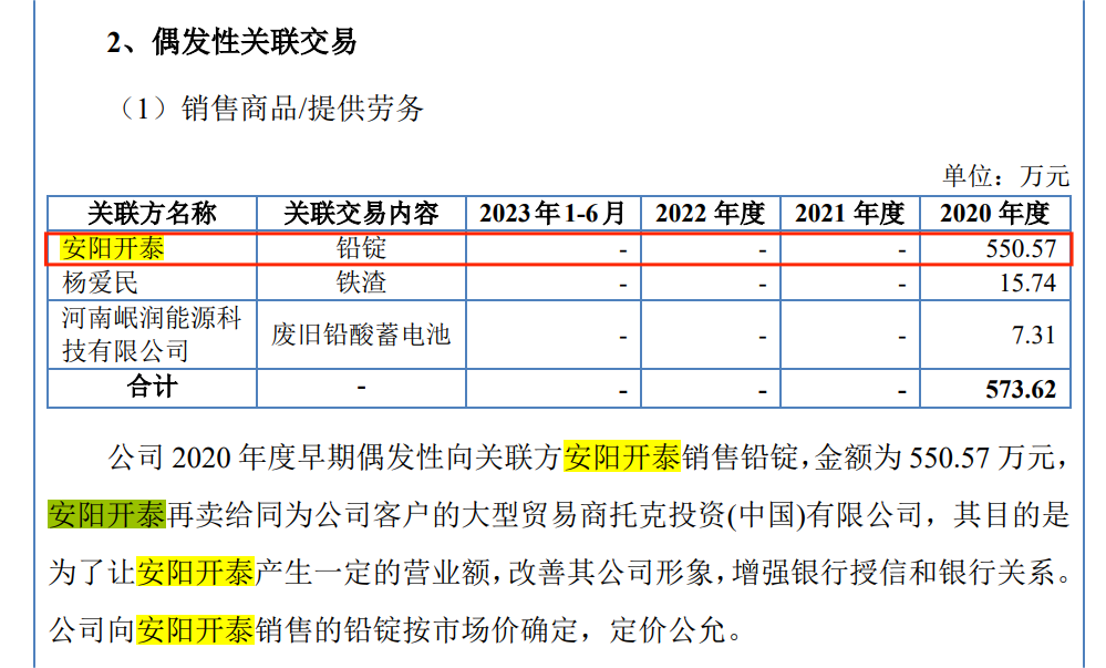 同在2020年,岷山环能向安阳开泰销售550.57万元的铅锭,再由安阳开泰销售予公司的客户托克中国。