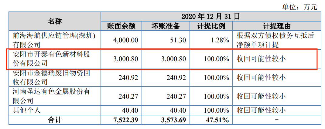 还是在2020年,岷山环能一共计提了3573.69万元坏账准备。其中,安阳开泰一家就计提了3000.8万元。