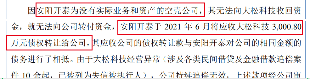 岷山环能本应向安阳开泰追回这笔款项,以保利益不受损失,但在2021年6月,安阳开泰将对大松科技3000.8万元债权转让给岷山环能后,轻松离去。