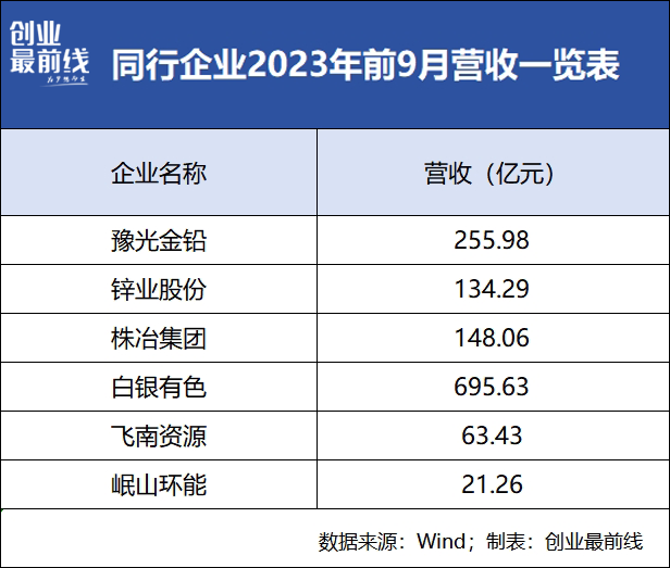 据Wind数据,2023年前9月,白银有色营收逼近700亿元,豫光金铅营收超200亿元,锌业股份、株冶集团营收超百亿,即便是成立时间比岷山环能晚了将近10年的飞南资源营收也超过60亿元。