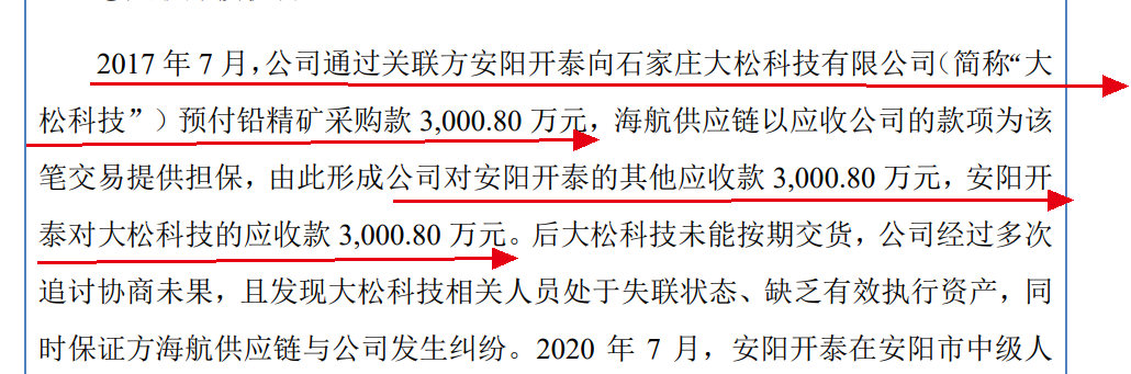 2017年7月,岷山环能通过安阳开泰向大松科技预付铅精矿采购款3000.80万元,形成岷山环能对安阳开泰的其他应收款3000.80万元,安阳开泰对大松科技的应收款3000.80万元。