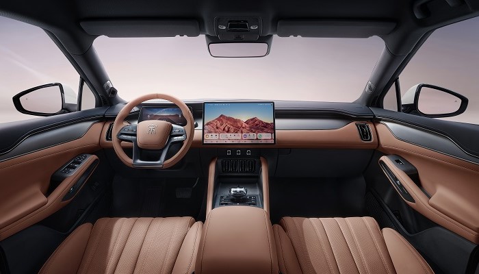 内饰风格主打简洁高级,采用环绕式氛围灯带和无框式车门。配备10.25英寸全液晶仪表盘,15.6英寸中控屏,以及50英寸AR-HUD。DiLink智能网联系统基于骁龙处理器,支持5G。其余配置则包括12扬HiFi级定制丹拿音响、主动香氛系统等。