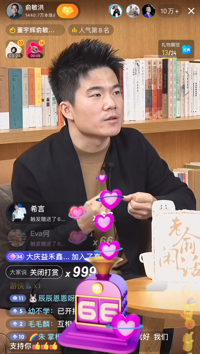 两人的直播全程保持10万+的在线人数,观众一边打赏不停,一边称“宇辉憔悴了”,并喊话俞敏洪,让他“善待宇辉”,粉丝们也会“尊重宇辉的决定”。