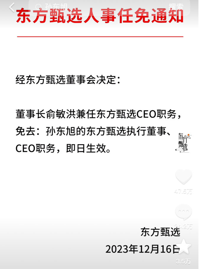 尽管曾遭到多次否认,12月16日,东方甄选最终迎来“二选一”的大结局。当日,东方甄选发布公告称免去孙东旭东方甄选执行董事、CEO职务,董事长俞敏洪兼任东方甄选CEO职务。