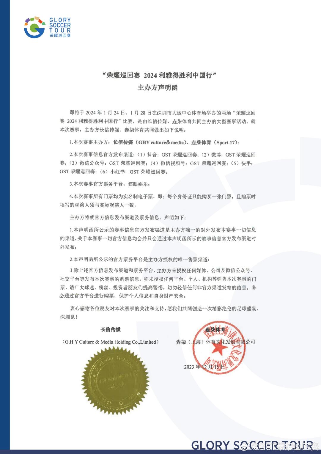 12月17日,2024荣耀巡回赛·利雅得胜利中国行官方微博发布消息称,利雅得胜利将在明年1月24日和28日分别对阵上海申花与浙江队,地点均在深圳大运中心体育场。