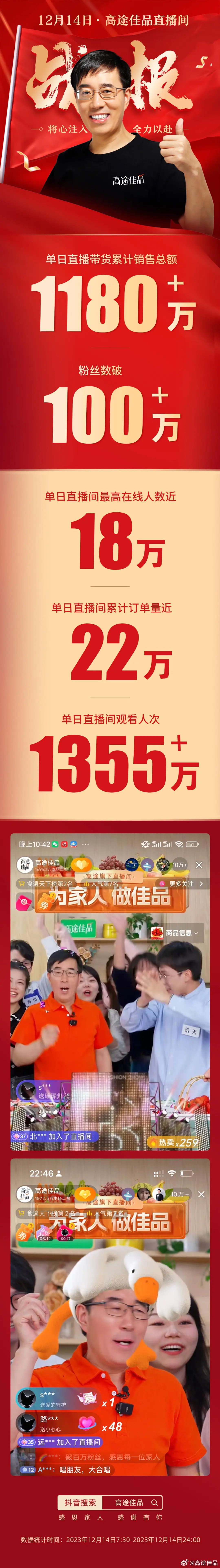 12月10日至12日,三天时间高途佳品直播间新增粉丝6.8万;12月14日,直播间粉丝数突破100万,超过十万人同时在线,高途佳品拿下抖音食品类目带货榜第一;这几天里,高途佳品直播间销售额是此前30天内日均销售额的100倍。12月16日凌晨一点,高途佳品的直播间依然热闹,两位主播兴奋地不打算下播,他们在等待着粉丝数超过170万。截至发稿,高途佳品直播间粉丝数已经超过200万。