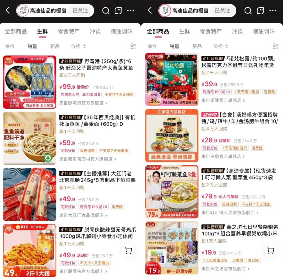 高途佳品和东方甄选都主做农产品、食品直播,目前高途佳品货架橱窗里有九种产品分类,生鲜、零食特产、冲饮、粮油调味、营养滋补等。高途佳品除了官方大号,还有一个名为「高途佳品珍食汇」的直播间,少量售卖一些生活、居家用品。